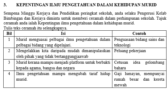 Pada minggu berikutnya 8 rencana dipilih dan sampel diminta untuk menjawab 6 soalan. Soalan 2 soalan pemahaman berdasarkan petikan 4 markah dan Soalan 3. Dalam era dunia tanpa sempadan hari ini orang yang berilmu akan terus maju kehadapan dan orang yang tidak berilmu akan terus.